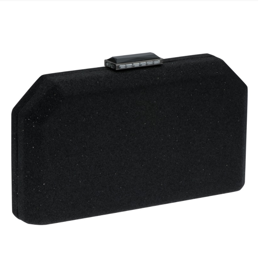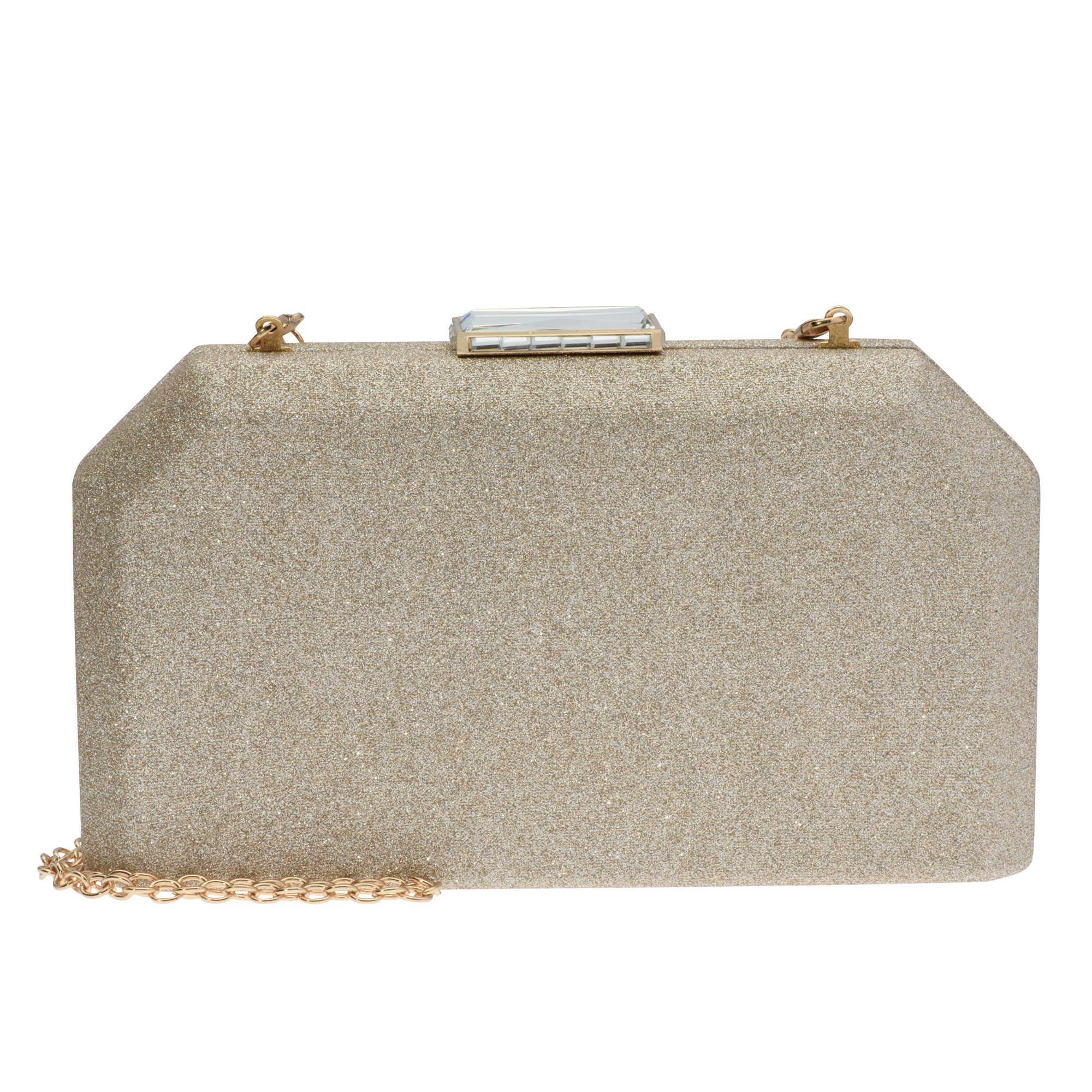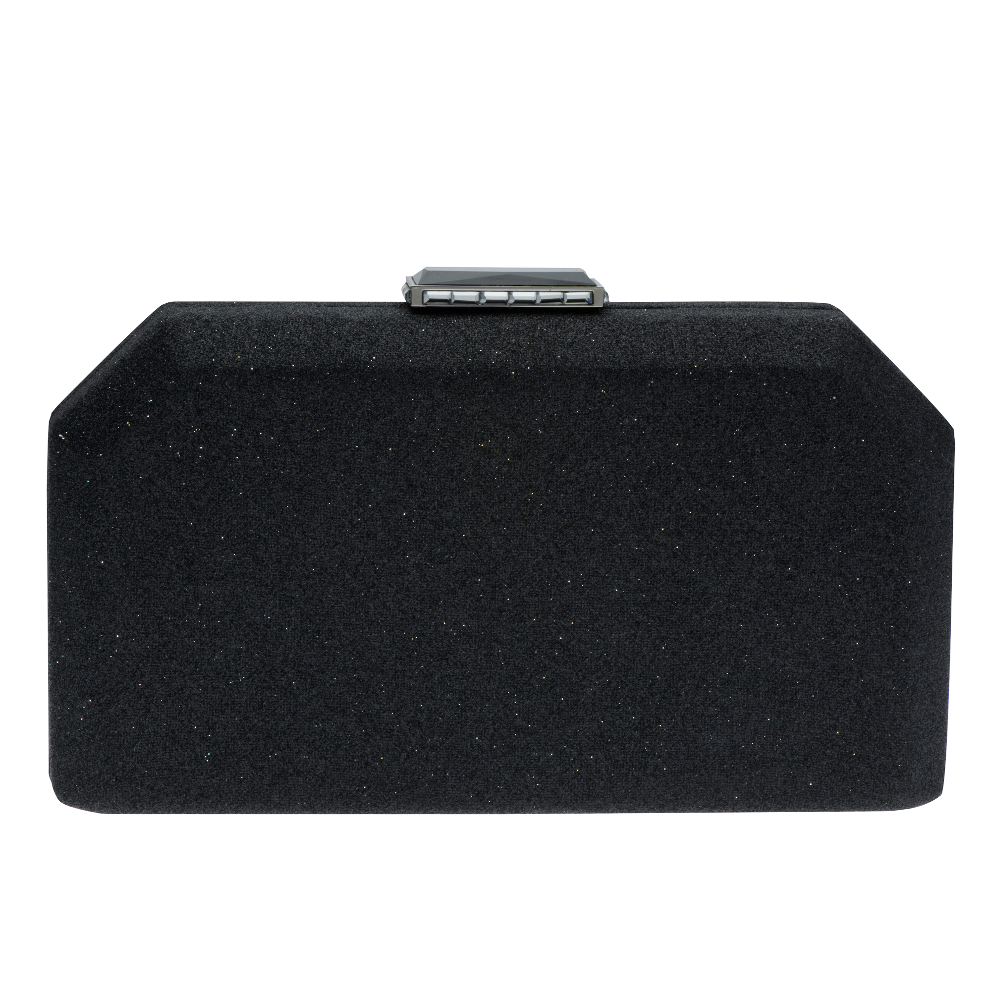 Preziosa borsetta rigida, sagomata, in tessuto effetto glitter, da portare a mano o a tracolla. Un accessorio perfetto da sfoggiare in occasioni speciali e adatto a completare look sofisticati.