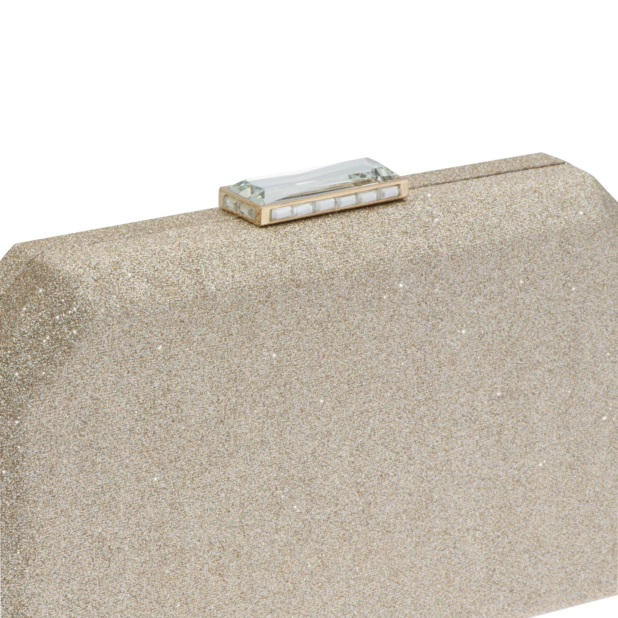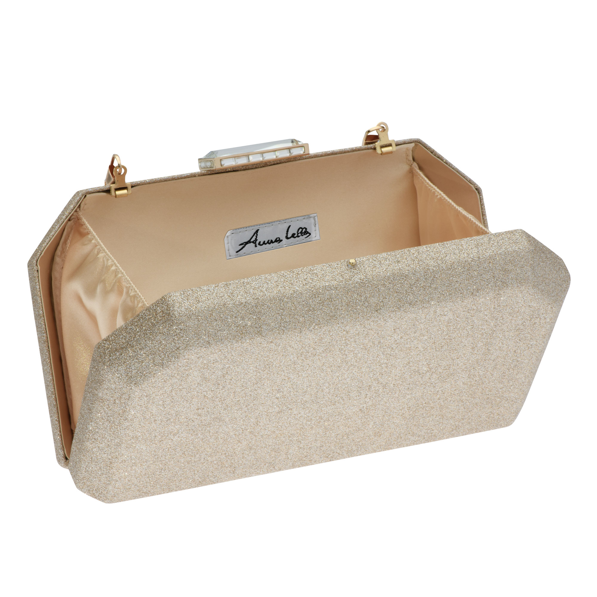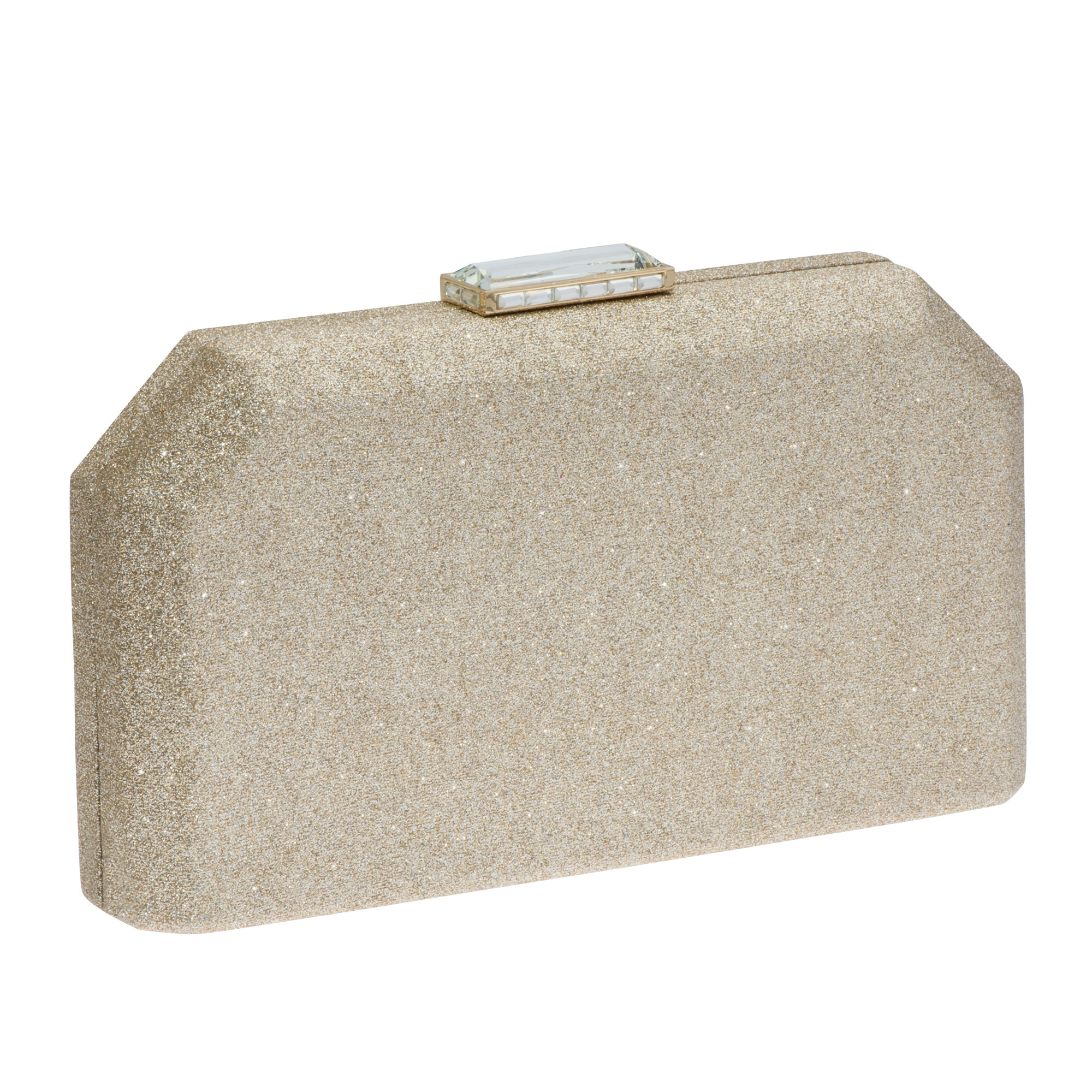 Preziosa borsetta rigida, sagomata, in tessuto effetto glitter, da portare a mano o a tracolla. Un accessorio perfetto da sfoggiare in occasioni speciali e adatto a completare look sofisticati.